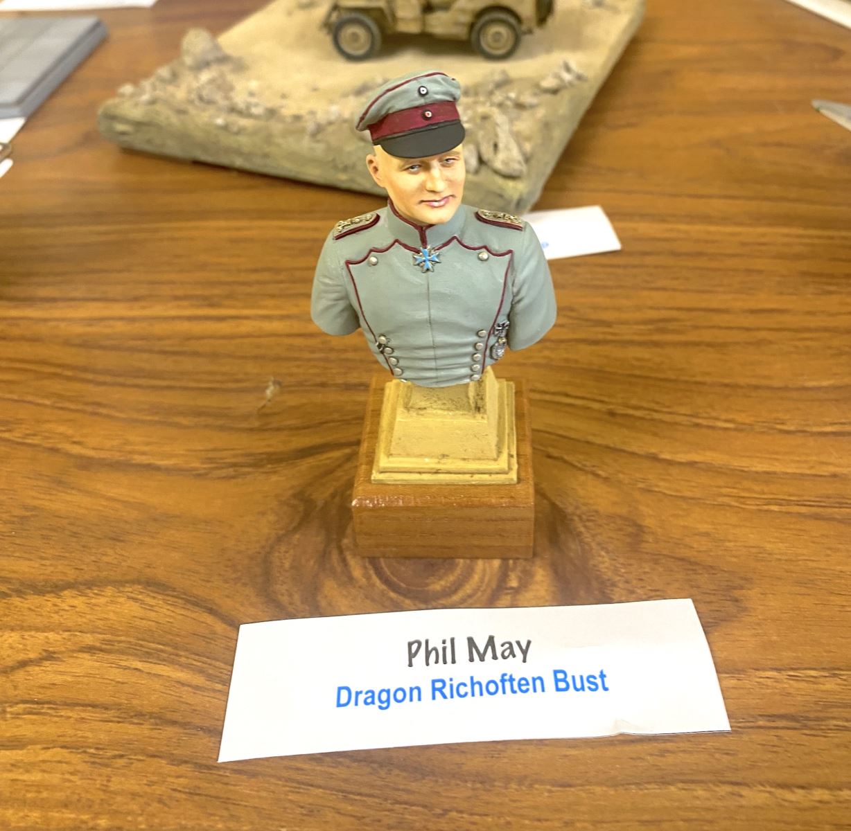 Seven models this month: Dave W's Matilda Bulldozer and M4A2 Sherman, Hugh's Zebras Crossing, Roger's American Indian and Felix's Snowspeeder. While Steve A brought along his Cerastus XL and Tesla Trooper figures along with a wooden tipper truck.