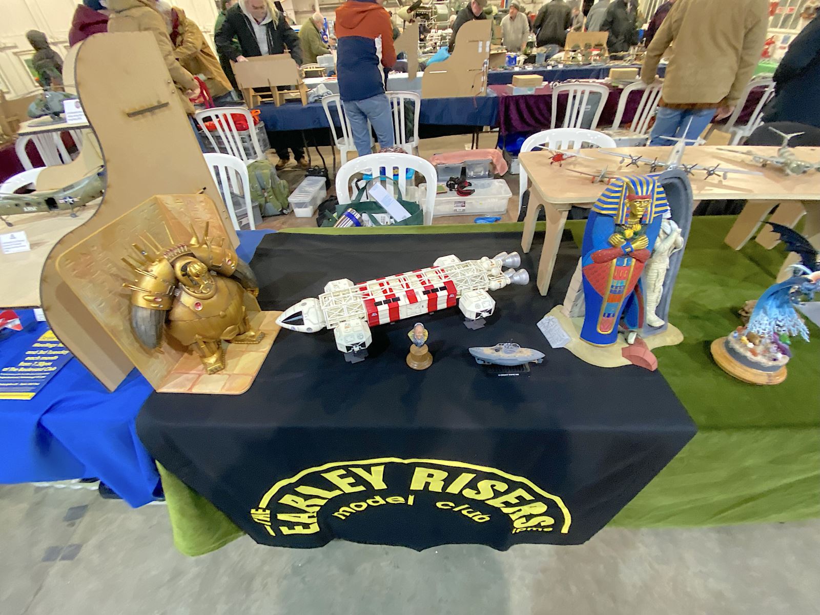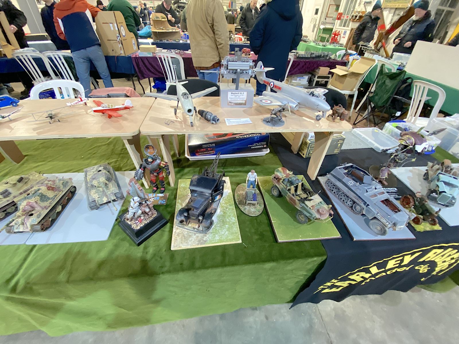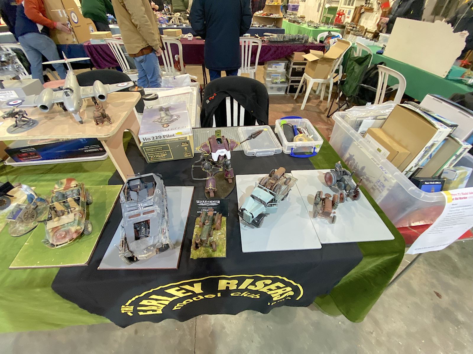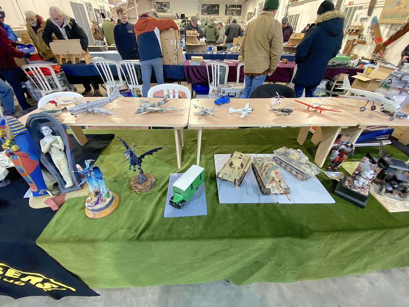 On a cold, sleeting morning, Liz & Steve arrived at Old Warden. They were closely followed by Tim P and Peter. While setting up the tables, we had to move them a couple of times to avoid the water drips coming from the hangar ceiling. In the end, there were several water buckets behind the stand, attempting to catch the drips!