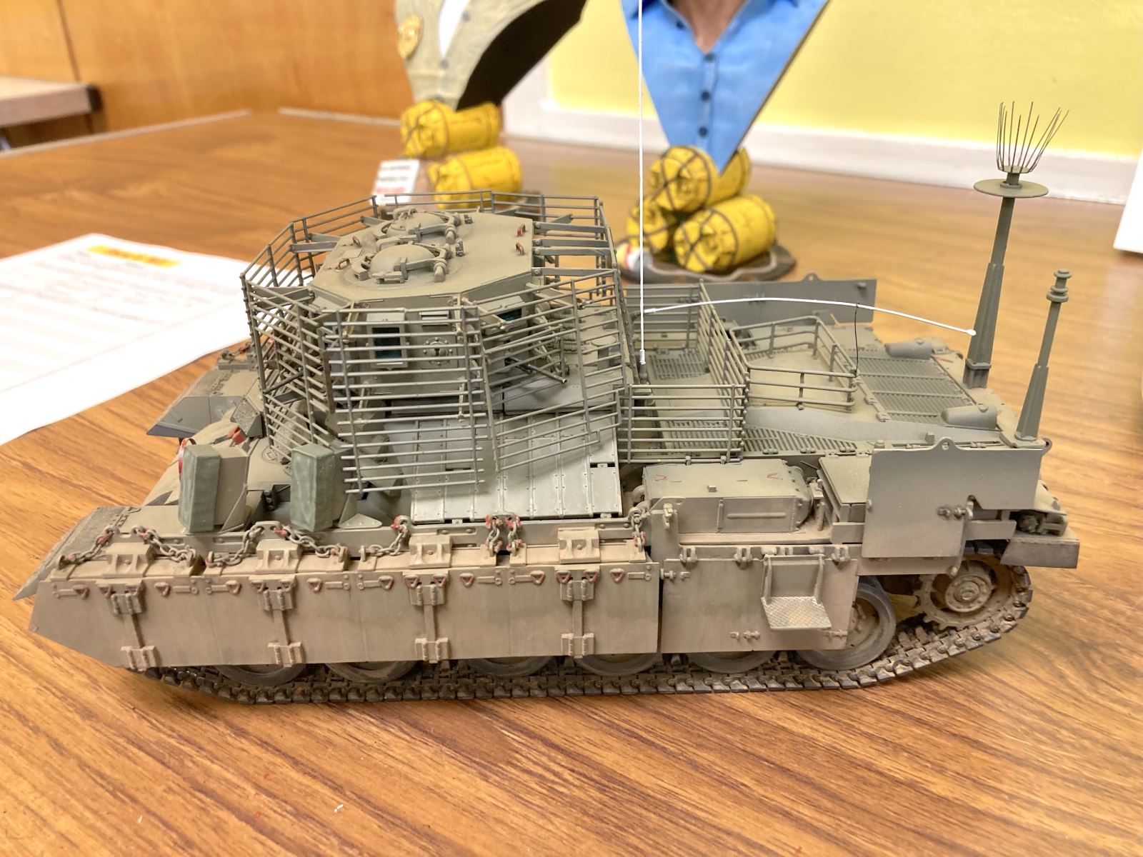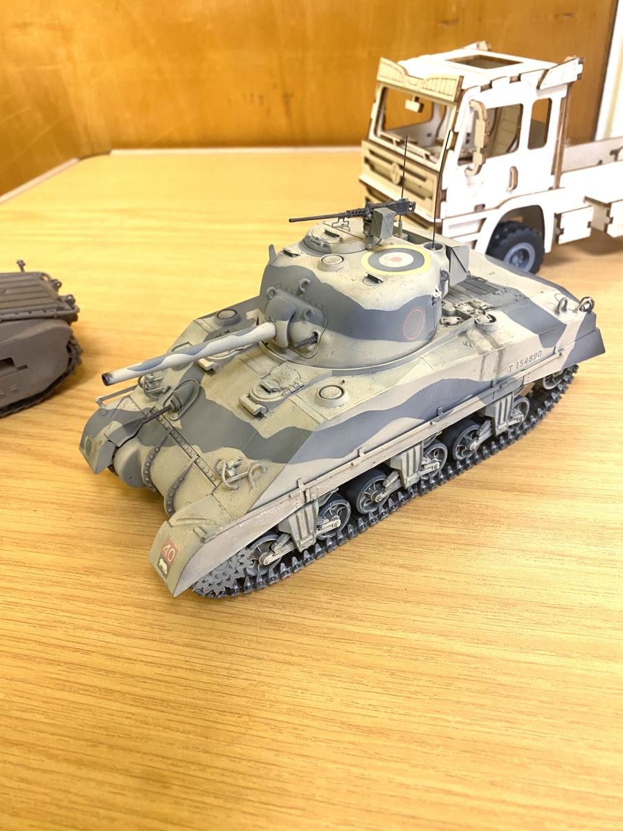Seven models this month: Dave W's Matilda Bulldozer and M4A2 Sherman, Hugh's Zebras Crossing, Roger's American Indian and Felix's Snowspeeder. While Steve A brought along his Cerastus XL and Tesla Trooper figures along with a wooden tipper truck.