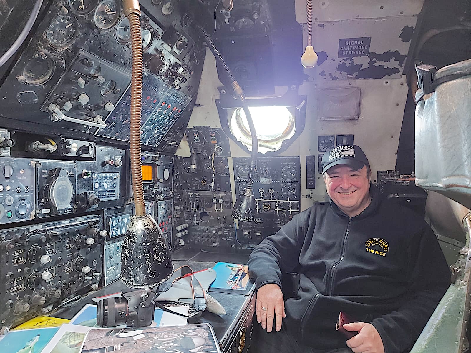 The Nige enjoying a rest in the back of a Vulcan cockpit